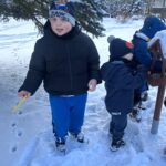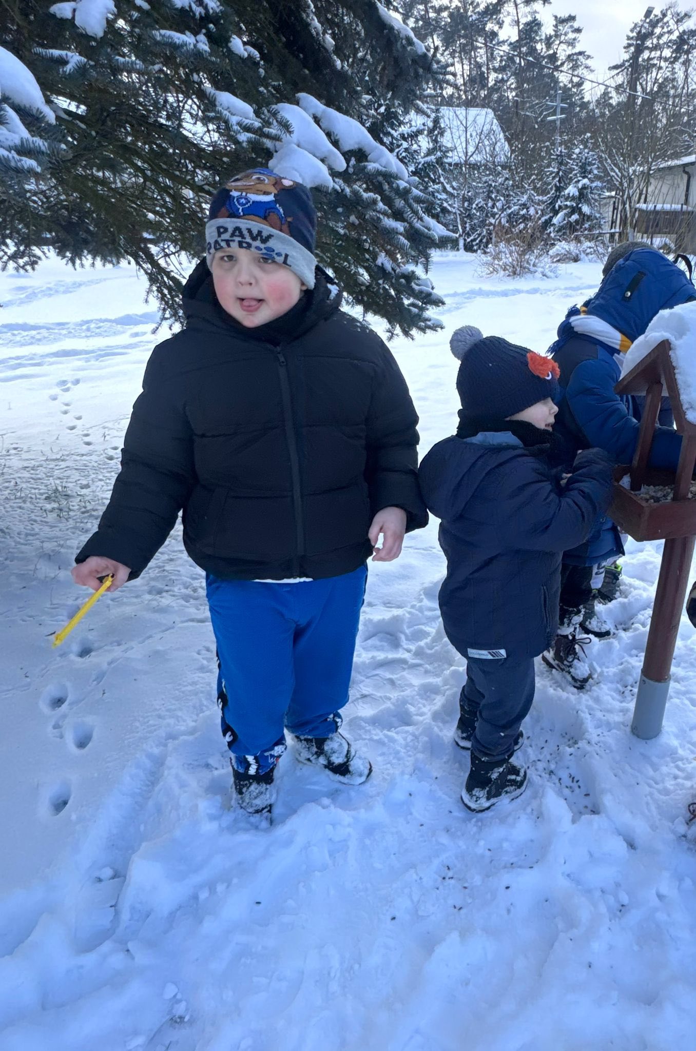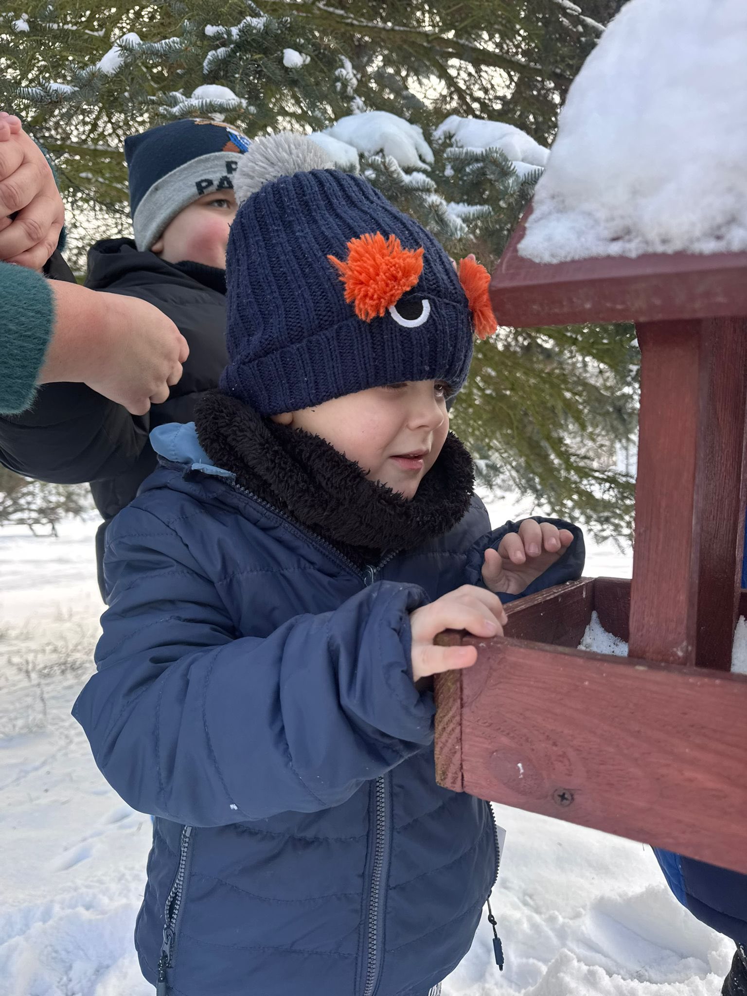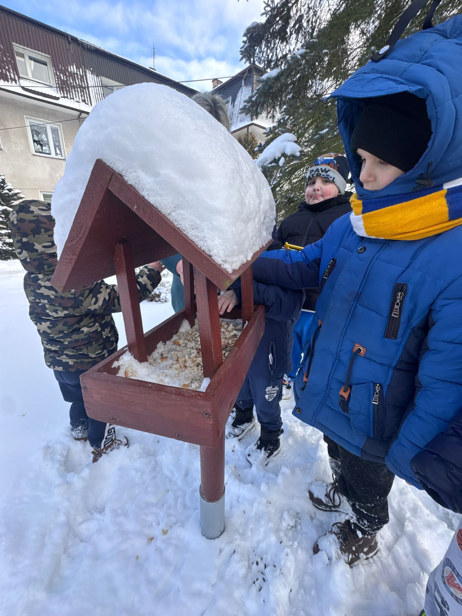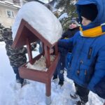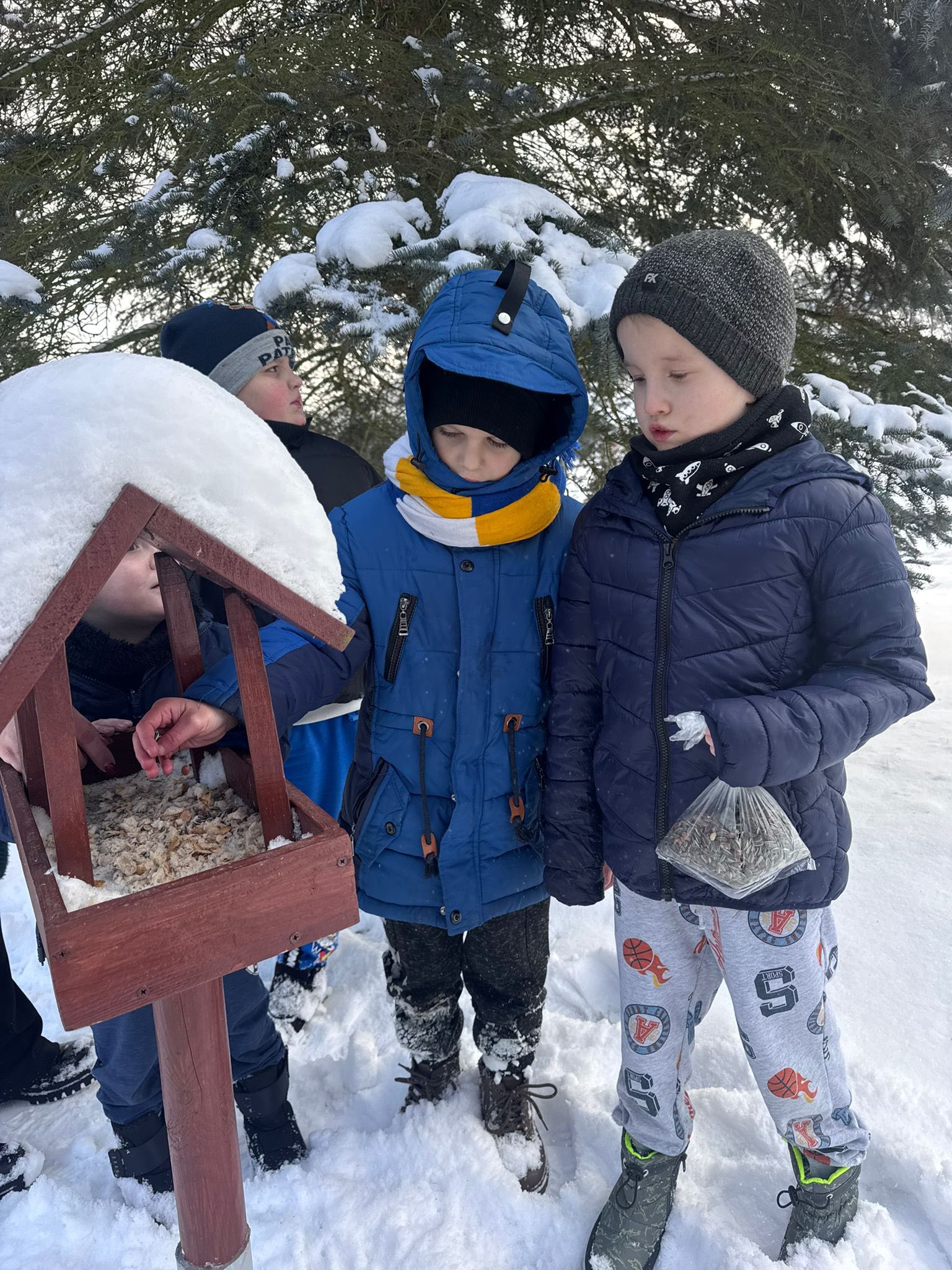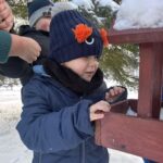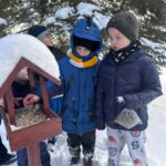 Dzieci z przedszkola zimą dokarmiają ptaki