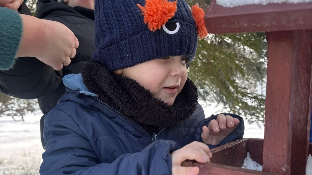 Dzieci z przedszkola zimą dokarmiają ptaki Wspólnie podchodzą do karmnika i wsypują do niego ziarenka. Ptaszki przylatują i jedzą przygotowany…